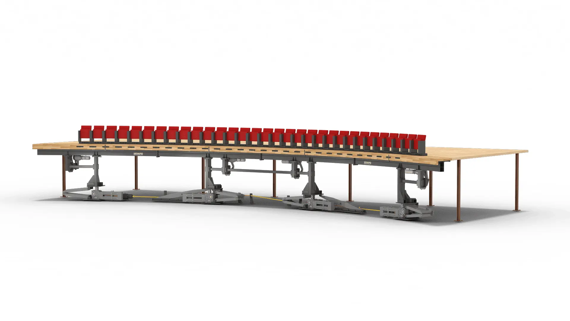 SERAPID의 Quick Seat eXchange(QSX) 시스템은 특허받은 LINKLIFT와 회전 동작을 결합하여, 모든 공간을 평면 바닥에서 다양한 높이의 좌석 열로 단 몇 분 만에 변형시킵니다.